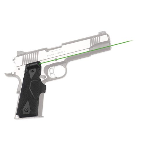 •Grip-integrated green laser sight •Instinctive activation ergonomically located pressure switch •W/E adjustments •Master On/Off switch •Molded to exactly fit firearm frame •Includes batteries •Fits Full-Size Frames Gov’t. & Commander variants •Polymer grip frame w/rubber overmold – front activation pad
