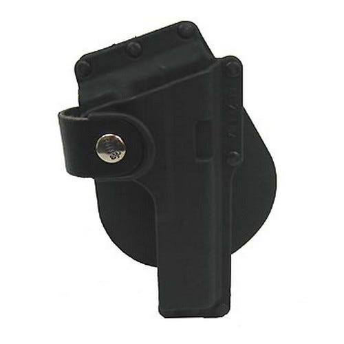 • Accommodates accessories mounted on weapon rails or trigger guards • Retention provided by leather thumb break & muzzle stud • Lightweight reinforced construction • Unique Roto-Holster system allows holster to be adjusted to employ a forward or rearward cant • Rotates 360° & adjusts easily for cross draw bodyguard driver small-of-the-back or strong side carry. • Patented locking adjustment system allows for 40 possible positions. • System can be used with shoulder rig thigh rig universal home & vehicle mount and Roto-MOLLE • Holds handgun with Laser or Light