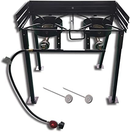 2-burner outdoor propane cook stove. Includes 2 high pressure 54,000-Btu burners. 392 sq inches of cooking area. Needle valves for individual burner control; snap on legs for easy storage. Also includes hose, regulator, connector; measures 28 x 14 x 30 inches (width by depth by height).