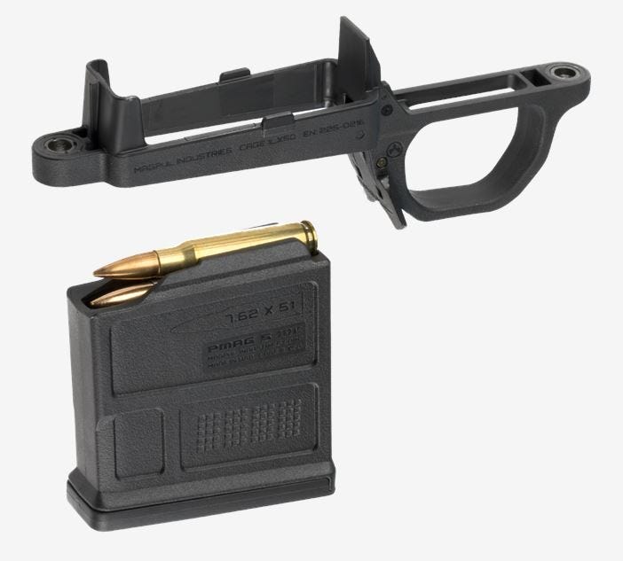 The Magpul Bolt Action Magazine Well is a drop-in solution for Magpul’s Remington 700 Hunter Stock for those that are wishing to add detachable box magazine capabilities to their rifle. By simply removing your OEM bottom metal and the insert on the Hunter 700 Stock, users can add this reinforced polymer trigger guard and magazine well to their rifle without the need for custom inletting from gunsmiths. Designed to work with AICS pattern, short action magazines. This kit also includes a Magpul PMAG 5 AC (5-Round Capacity, 7.62×51).