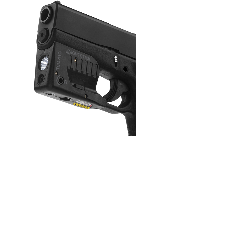 The TSM-11G Subcompact Tactical Weapon-Mounted Light with Green Laser for Glock G42/G43/G43X/G48 pistols uses a super-bright LED rated at 150 lumens working in conjunction with a precision-engineered miniature reflector to create a bright white beam of light rated at 100 meters. This weapon light features completely ambidextrous and intuitive toggle switches on each side of the light to operate the momentary-on and constant-on lighting modes or Class IIIa 532nm daylight-visible green laser. These lighting modes include white light, laser, or both light and laser. The two glass-filled nylon plastic housings of the TSM-11G is designed to lock onto the front of the pistol’s trigger guard for secure installation and the lowest profile possible. The weapon light includes Nightstick MagMate USB magnetically coupled charger, a trigger lock for secure charging, and Allen screwdriver for installation and laser aim adjustments.