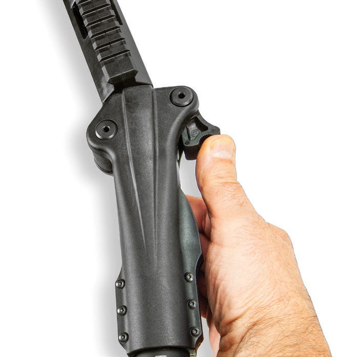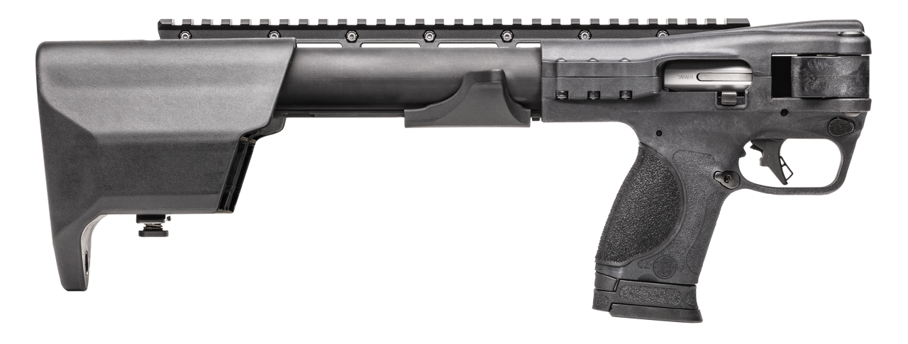 This full sized folding carbine also features an integrated recoil buffer system, a horizontal folding mechanise (with locking latch), a charging slide/handle that doubles as a retainer when folded, and a 16.25″ 4140 steel, threaded, barrel (thread pattern 1/2″x28 tpi). It also comes with a M-LOK handguard with top Picatinny-style rail for mounting optics, a flat trigger, a hard-coat black anodized aluminum receiver and frame, and a stainless steel bolt carrier. The horizontal folding design allows you to fold the carbine without having to remove any top mounted optics. This feature-packed FPC is made in the U.S.A.and is backed by Smith & Wesson’s limited lifetime service policy.