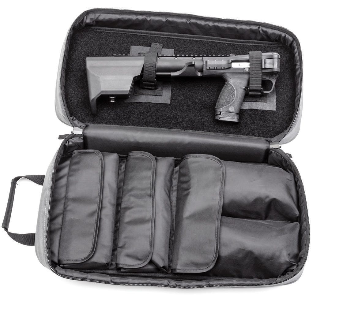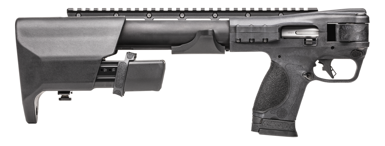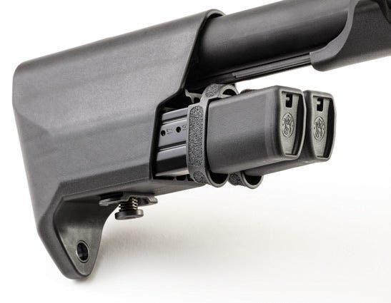 The new optics-ready M&P FPC showcases a brand new, compact, folding design. The carbine ships with (one) 17-round and (two) 23-round magazines. The black polymer stock on the rifle includes “in-stock” magazine storage with a quick-release latch. This storage compartment holds two magazines. Additionally, the Smith & Wesson  M&P FPC is compatible with S&W M&P full-size and compact pistol double-stack magazines. Need a place to keep it all together? No problem. Smith & Wesson even includes a carrying bag with additional storage and Velcro straps.