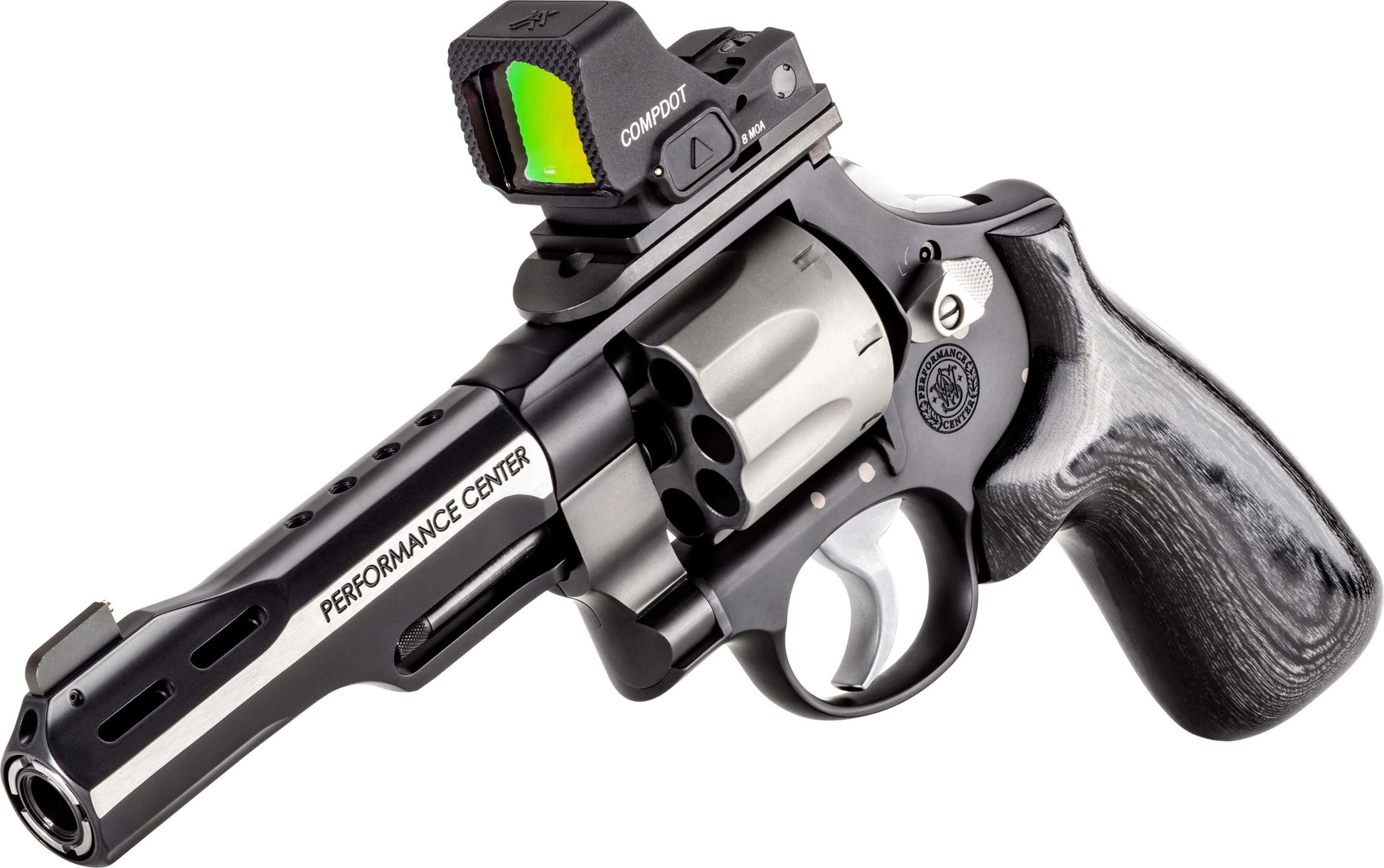 The Smith & Wesson Performance Center Model 327 WR combines cutting-edge design with classic revolver performance. The black and stainless steel ported barrel reduces recoil and muzzle rise, while the Jerry Miculek Signature black laminate grips ensure a comfortable, secure hold. The titanium cylinder provides durability without adding unnecessary weight, and the scandium alloy N-frame ensures both strength and lightness.