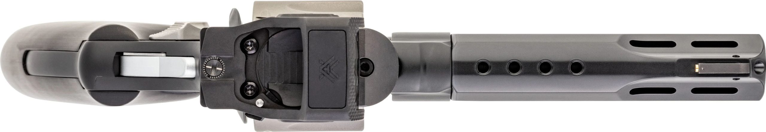 This revolver is equipped with brass bead front sights and an adjustable rear sight for accurate target acquisition. The inclusion of the Vortex CompDot optic with an 8 MOA dot enhances precision, while the C.O.R.E. Optic System ensures quick and easy optic attachment. The revolver’s chromed stainless steel trigger offers a smooth and consistent pull for reliable shooting.