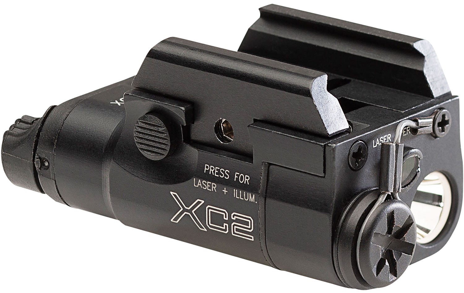The XC2-B features a durable black anodized aluminum body, ensuring resilience against recoil and weather elements. The overall length of 2.52 inches and a weight of just 2.10 oz allow for easy attachment to a handgun without impacting handling or balance.