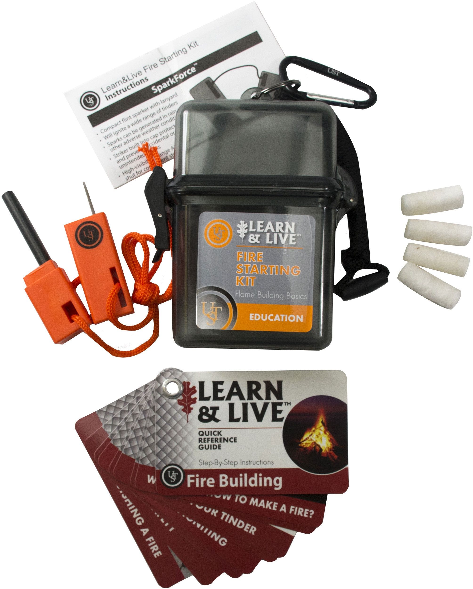 The Learn & Live Fire Starting Kit includes all the tools you need to build a fire using a ferro rod and fire tinder.