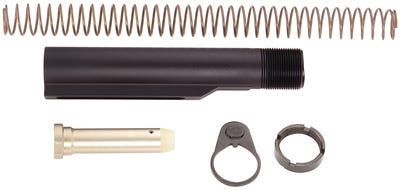 For your next custom AR15, M16, M4 build. Carbine receiver extension (buffer tube) machined from 7075T6 and manufactured to Mil-Spec dimensions and specifications. Hard coat anodized per Mil-A-8625F, Type III, Class 2. These tubes should be used with stocks such as USGI, BCM, Colt, LMT, SOPMOD, VLTOR, Stag Arms, Magpul CTR (Milspec) and others that are made to the Mil-Spec size. Kit includes: Receiver extension, receiver end plate, receiver castle nut, standard carbine buffer and carbine buffer spring.